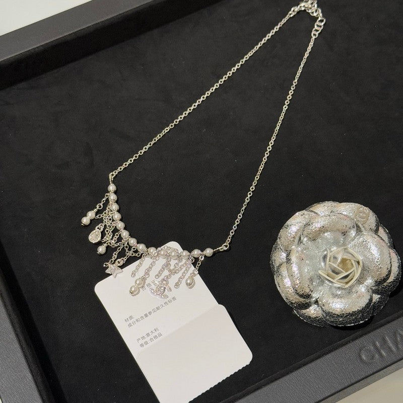 18K CC 26C Pearl Diamond Tassel Choker Necklace