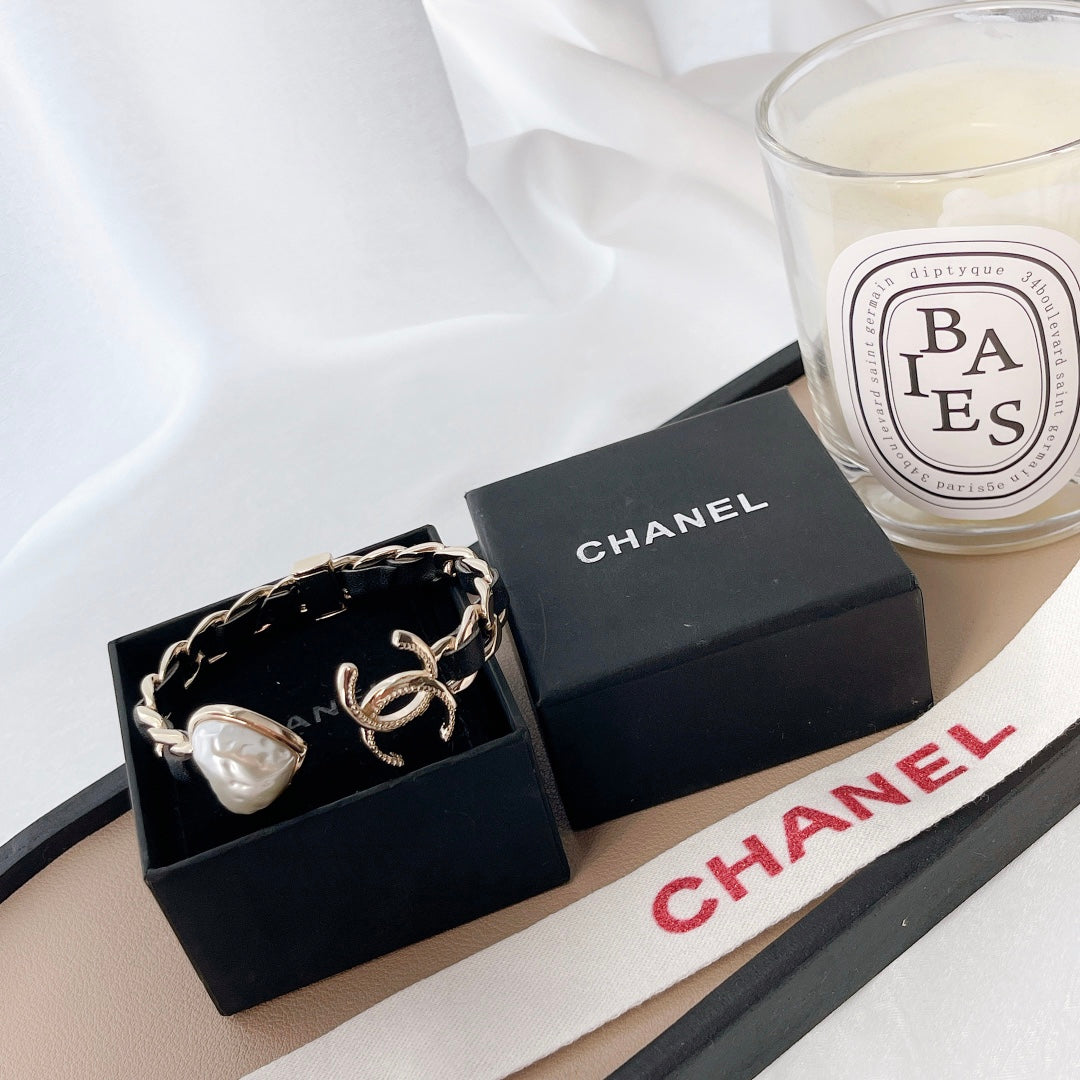 - Metal, Calfskin & Strass, Yellow Gold, Black & Pearl